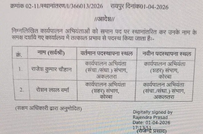 कोरबा, 02 अप्रैल। शहर के बिजली विभाग में बड़ा प्रशासनिक बदलाव सामने आया है। विद्युत वितरण कंपनी के कार्यपालन अभियंता (EE) रोशन वर्मा का तबादला कर दिया गया है। उनकी जगह अब राजेश चौहान को कोरबा शहर का नया कार्यपालन अभियंता नियुक्त किया गया है। इस आदेश के जारी होते ही विभागीय हलकों में हलचल तेज हो गई है और नई व्यवस्था को लेकर चर्चाओं का दौर शुरू हो गया है।