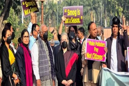 वायु प्रदूषण पर संसद परिसर में विपक्ष का जोरदार प्रदर्शन