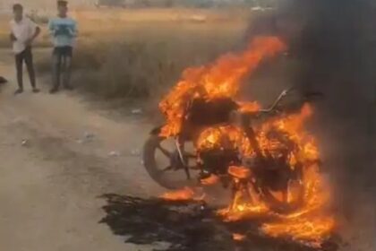 खड़ी बाइक में लगी आग पेट्रोल टंकी फटने से अफरा-तफरी…