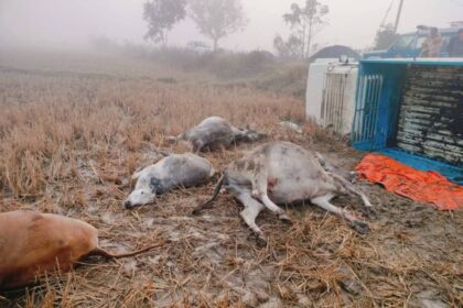 छत्तीसगढ़ में गौ तस्करी का खुलासा : तेज रफ्तार पिकअप पलटने से 4 गौवंशों की मौत, 5 घायल, तस्कर मौके से फरार