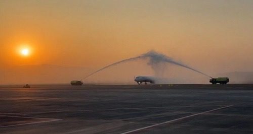 हवाई अड्डे पर आने और जाने वाली पहली उड़ानों के लिए पारंपरिक वाटर कैनन सैल्यूट दिया गया।