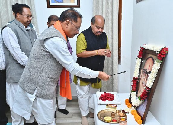 Raipur, December 28, 2025/ Chief Minister Shri Vishnu Deo Sai today, at his Residence Office in Raipur, paid heartfelt tribute to the revered public leader Kushabhau Thakre Ji on his death anniversary by offering floral homage at his portrait. On the occasion, Member of Parliament Shri Santosh Pandey, MLA Shri Prabodh Minj, MLA Shri Purandar Mishra, along with several other public representatives, were present.