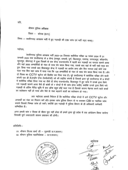 कोरबा,01 जनवरी (वेदांत समाचार)। छत्तीसगढ़ पुलिस आरक्षक भर्ती प्रक्रिया को लेकर एक बार फिर गंभीर आरोप सामने आए हैं। सोशल मीडिया पर वायरल एक पत्र में भर्ती के दौरान बड़े पैमाने पर अनियमितता और नंबरों में हेरफेर का दावा किया गया है। पत्र में इस पूरे मामले की CBI अथवा न्यायिक जांच कराए जाने की मांग की गई है।