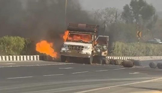 महासमुंद,12 जनवरी(वेदांत समाचार)। छत्तीसगढ़ के महासमुंद जिले के सिंघोड़ा थाना क्षेत्र अंतर्गत नेशनल हाईवे-53 पर गुरुवार को बड़ा हादसा हो गया। छुईपाली के पास गैस सिलेंडर से भरी एक पिकअप वाहन में अचानक आग लग गई। बताया जा रहा है कि गैस सिलेंडर ब्लास्ट होने के कारण वाहन में आग भड़क उठी। घटना के बाद हाईवे पर अफरा-तफरी मच गई। आग इतनी तेज थी कि दूर से ही धुएं का गुबार दिखाई देने लगा। राहगीरों ने तुरंत इसकी सूचना पुलिस और प्रशासन को दी।