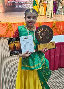 कथक नृत्य प्रतियोगिता में छत्तीसगढ़ का प्रतिनिधित्व कर रहीं इशिता कश्यप ने अपनी दमदार प्रस्तुति से सभी प्रतिभागियों को पीछे छोड़ दिया। सधे हुए पैरों की थाप, प्रभावशाली हस्त-मुद्राएं और भावपूर्ण अभिनय के साथ विभिन्न लयों में किए गए 150 से अधिक चक्कर निर्णायक मंडल और दर्शकों के लिए आकर्षण का केंद्र रहे। उनकी प्रस्तुति को सर्वश्रेष्ठ मानते हुए उन्हें प्रथम पुरस्कार से सम्मानित किया गया।