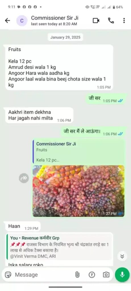 दरअसल, दुर्ग नगर निगम में असिस्टेंट ग्रेड-3 भूपेंद्र गोइर ने एडवोकेट संदीप दुबे और मानस वाजपेयी के माध्यम से हाईकोर्ट में याचिका दायर की है। कर्मचारी ने याचिका के साथ वाट्सएप चैट्स के स्क्रीनशॉट हाईकोर्ट में पेश किए हैं। जिसमें निगम कमिश्नर सुमित अग्रवाल ने कर्मचारी से कई बार निजी फरमाइश की, इसमें लाल अंगूर, सेब, संतरा समेत कई फल, 10 किलो जवा फूल चावल, मूवी की कार्नर सीट की दो टिकट, गैस सिलेंडर, बंगले के लिए एसी समेत कई मांग की। इसके अलावा एमआईसी को स्थगित करने पर भी सवाल पूछे। इसके अलावा एक अन्य कर्मचारी के लिए लिखा कि उसे समझा देना, हटा दूंगा। एमआईसी की बैठक कैंसिल करने को लेकर भी कर्मचारी से सलाह मांगी। वहीं एक कर्मचारी के संबंध में लिखा गया कि उसको समझा देना, नहीं तो हटा दूंगा।