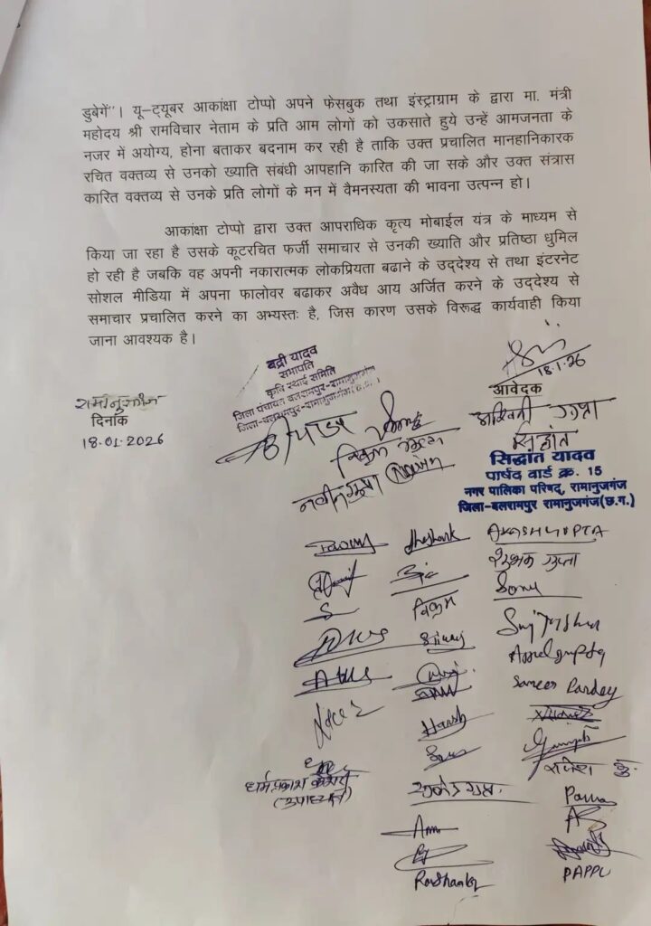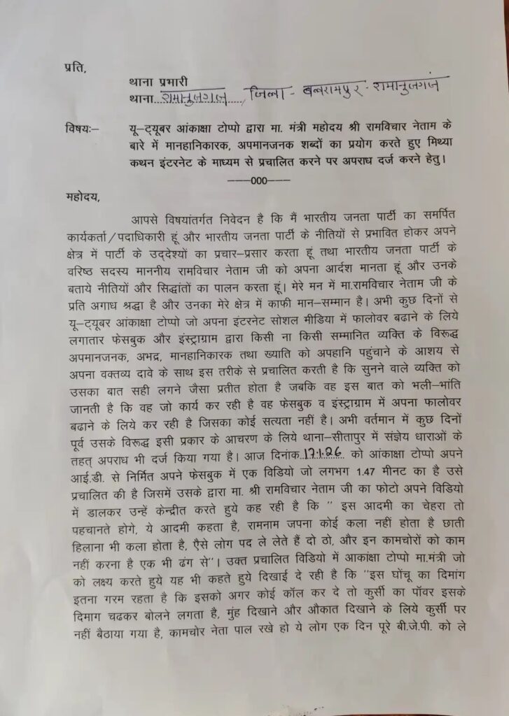 थाना रामानुजगंज, जिला बलरामपुर-रामानुजगंज में भाजपा कार्यकर्ताओं द्वारा यू-ट्यूबर आकांक्षा टोप्पो के खिलाफ गंभीर आरोपों के साथ आवेदन दिया गया है। शिकायत में कहा गया है कि आकांक्षा टोप्पो ने अपने फेसबुक अकाउंट से लगभग 1 मिनट 47 सेकंड का एक वीडियो प्रसारित किया, जिसमें छत्तीसगढ़ शासन के मंत्री एवं भाजपा के वरिष्ठ नेता रामविचार नेताम को केंद्र में रखते हुए अभद्र, अपमानजनक और मानहानिकारक शब्दों का प्रयोग किया गया।