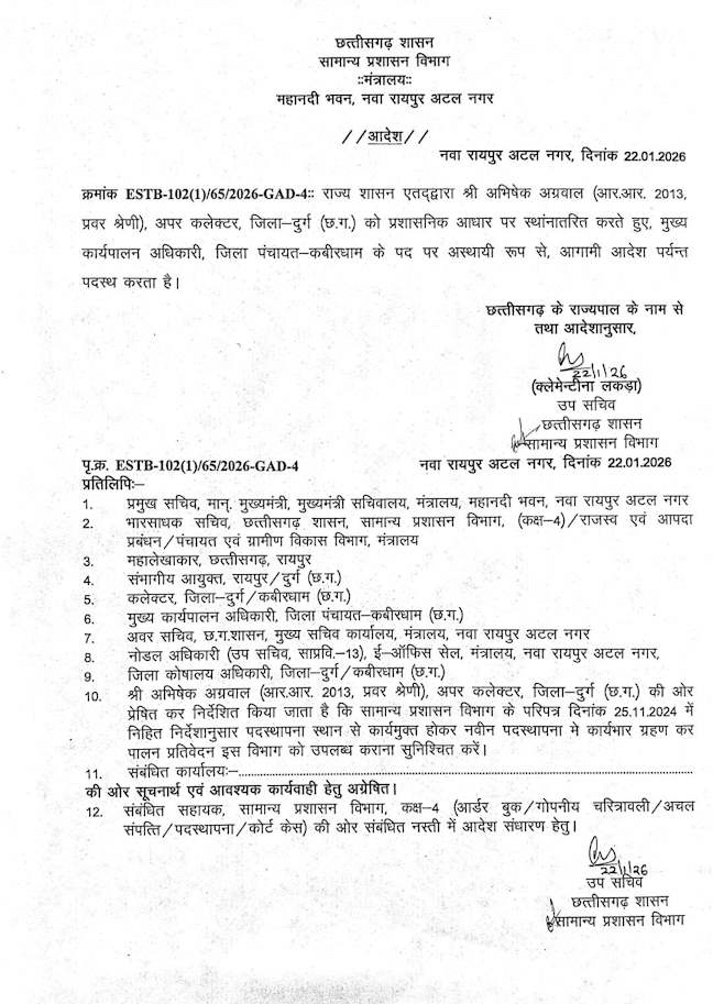 रायपुर,22 जनवरी। दुर्ग में पदस्थ अपर कलेक्टर अभिषेक अग्रवाल को कबीरधाम जिला पंचायत के मुख्य कार्यपालन अधिकारी के पद पर पदस्थ किया गया है.