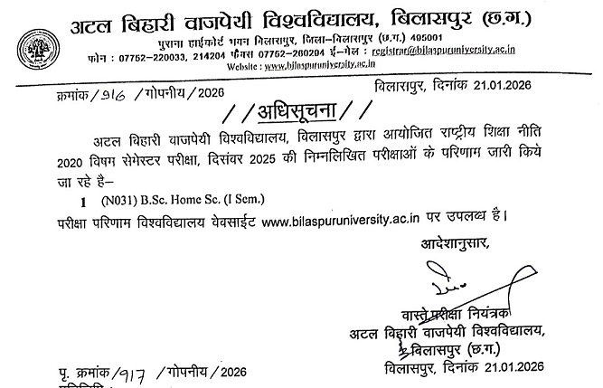 बिलासपुर ,22 जनवरी (वेदांत समाचार) । अटल बिहारी वाजपेयी विश्वविद्यालय में अध्ययनरत विद्यार्थियों के लिए बुधवार का दिन खास रहा। राष्ट्रीय शिक्षा नीति (NEP) 2020 के अंतर्गत आयोजित बीएससी होम साइंस प्रथम सेमेस्टर (NEP) परीक्षा सत्र 2025–26 का परिणाम 21 जनवरी को घोषित कर दिया गया। इसी के साथ एनईपी के अंतर्गत आयोजित परीक्षाओं का अंतिम चरण भी संपन्न हो गया।