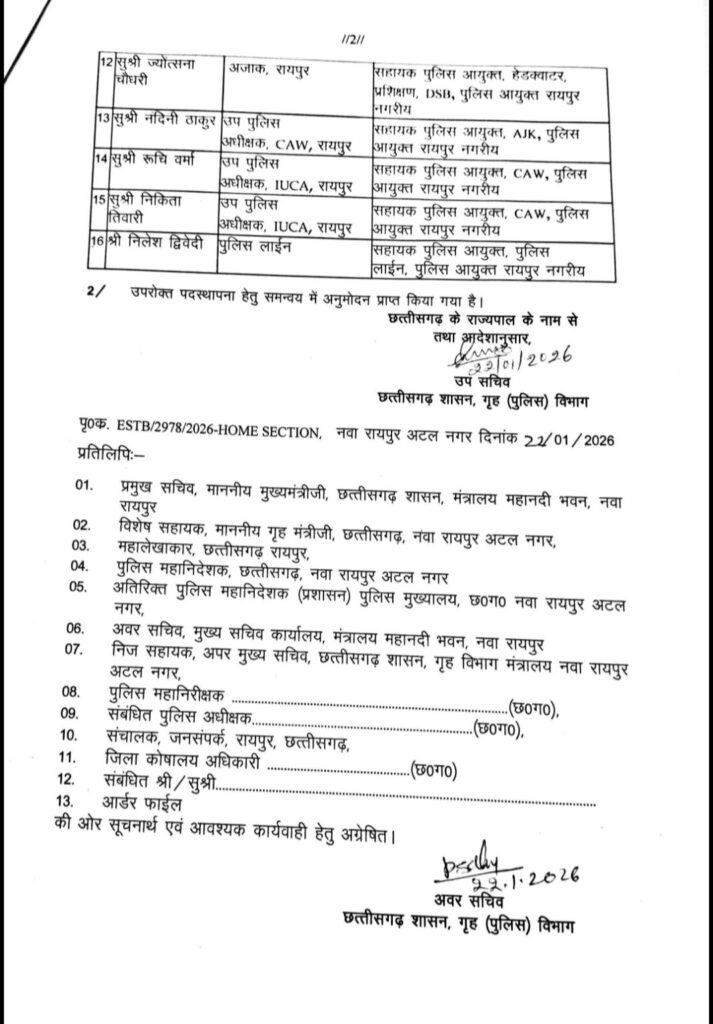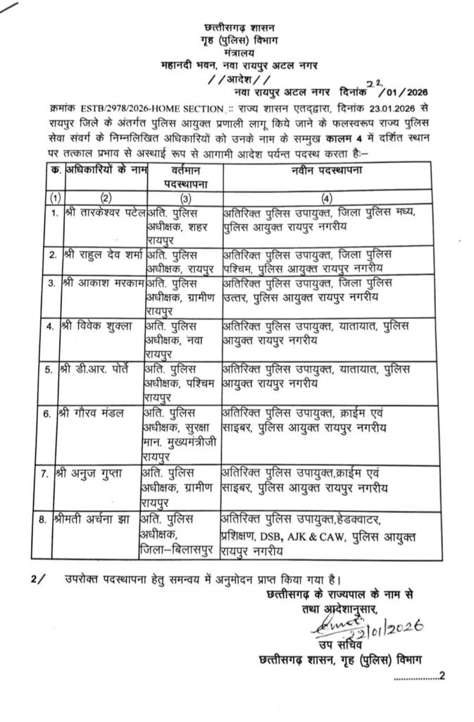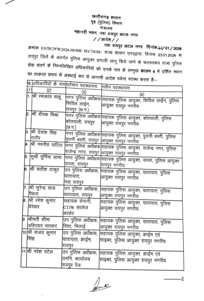 रायपुर। छत्तीसगढ़ शासन के गृह (पुलिस) विभाग ने पुलिस आयुक्त प्रणाली लागू करने के तहत रायपुर जिले में बड़े स्तर पर राज्य पुलिस सेवा के अधिकारियों का पदस्थापना के आदेश जारी किए हैं। यह आदेश 23 जनवरी 2026 से प्रभावशील होगा। लिस्ट में अतिरिक्त पुलिस अधीक्षक, नगर पुलिस अधीक्षक और उप पुलिस अधीक्षक के नाम शामिल है।