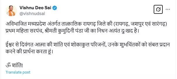 रायपुर,17 मार्च (वेदांत समाचार) । प्रथम महिला सरपंच कुमुदिनी पंडा का निधन हो गया है। X में शोक जताते हुए सीएम ने कहा, अविभाजित मध्यप्रदेश अंतर्गत तात्कालिक रायगढ़ जिले की (रायगढ़, जशपुर एवं सारंगढ़) प्रथम महिला सरपंच, श्रीमती कुमुदिनी पंडा जी का निधन अत्यंत दुःखद है।