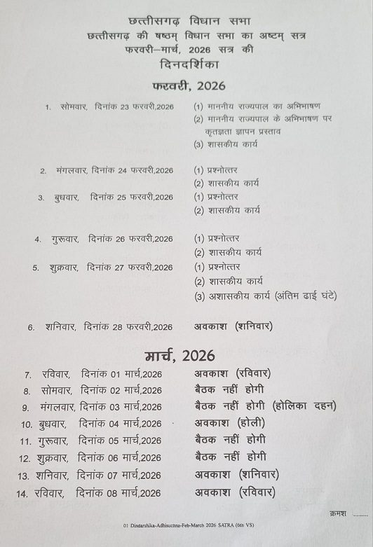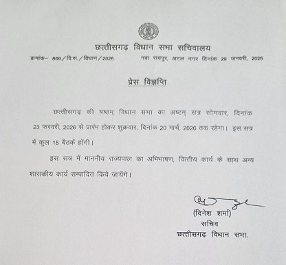 रायपुर,29 जनवरी (वेदांत समाचार)। छत्तीसगढ़ विधानसभा सचिवालय ने बजट सत्र 2026 के लिए आधिकारिक अधिसूचना जारी कर दी है। सत्र 23 फरवरी से 20 मार्च तक चलेगा और इस दौरान कुल 15 बैठकें आयोजित की जाएंगी।