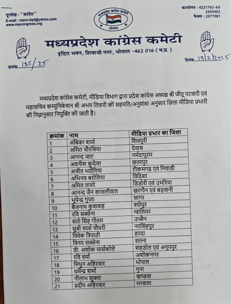 वहीं मिथुन अहिरवार को भोपाल, रवि सक्सेना को ग्वालियर, संतो सिंह गौतम को उज्जैन, स्पर्स चौधरी को नरसिंहपुर, विवेक त्रिपाठी को हरदा, विनय सक्सेना को सतना, डॉ अशोक मार्सकोले को शहडोल व अनूपपुर, रवि वर्मा को अशोकनगर, धर्मेंद्र शर्मा को गुना, नीलाभ शुक्ला को खंडवा और प्रदीप अहिरवार को मंडला जिले का मीडिया प्रभारी बनाया गया है।