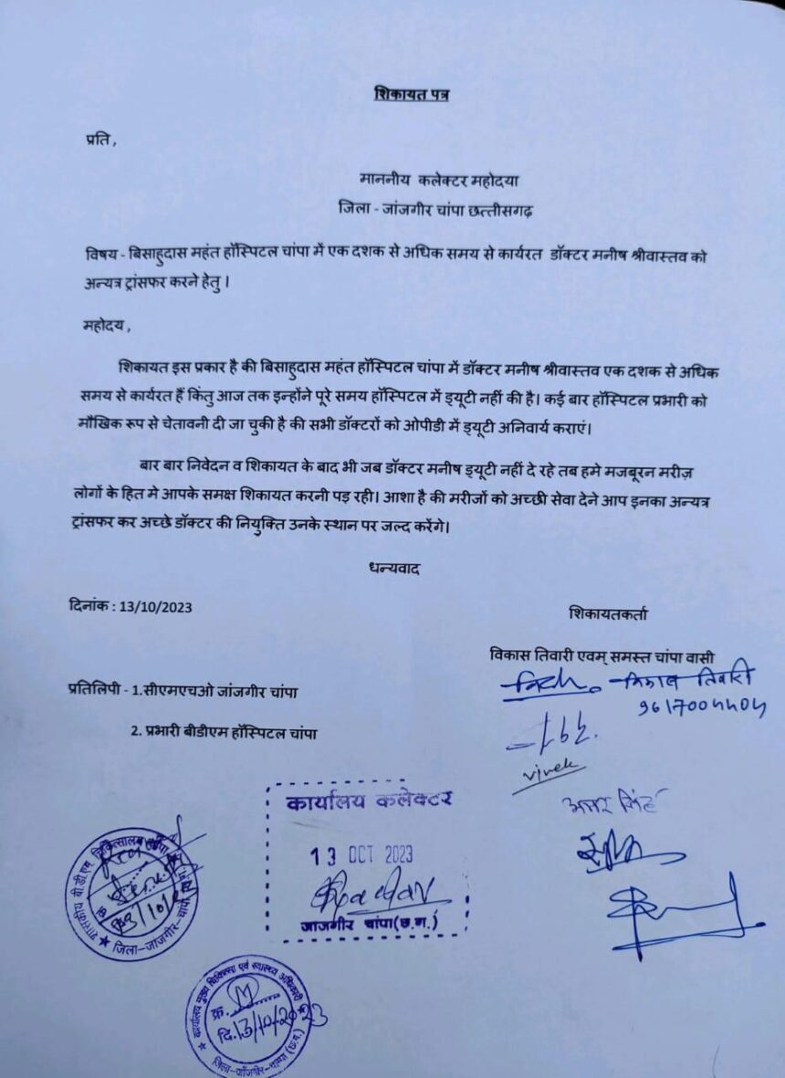 उल्लेखनीय है कि डॉ. मनीष श्रीवास्तव जब बीडीएम अस्पताल चांपा में पदस्थ थे, उस दौरान स्थानीय नागरिकों द्वारा कलेक्टर को लिखित शिकायत दी गई थी। शिकायत में आरोप लगाया गया था कि वे ओपीडी में नियमित रूप से उपस्थित नहीं रहते थे, जिससे मरीजों को इलाज के लिए घंटों इंतजार करना पड़ता था और कई बार उन्हें भटकना भी पड़ता था। नागरिकों का कहना था कि डॉक्टर की लगातार गैर-मौजूदगी से सरकारी स्वास्थ्य सेवाओं की विश्वसनीयता प्रभावित हो रही थी।