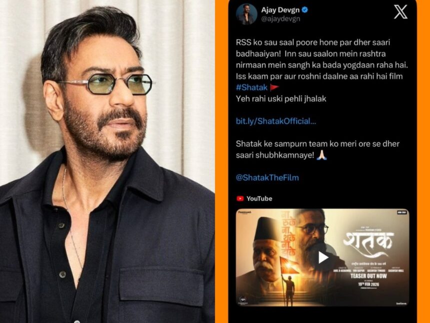 आरएसएस के 100 वर्ष पूरे होने पर अभिनेता अजय देवगन ने अपने ट्वीट में लिखा, “आरएसएस के सौ साल पूरे होने पर ढेर सारी बधाइयाँ। इन सौ वर्षों में राष्ट्र निर्माण में संघ का बड़ा योगदान रहा है। इस यात्रा पर और रोशनी डालने आ रही है फिल्म #शतक। यह रही उसकी पहली झलक। शतक की पूरी टीम को मेरी ओर से शुभकामनाएँ।”