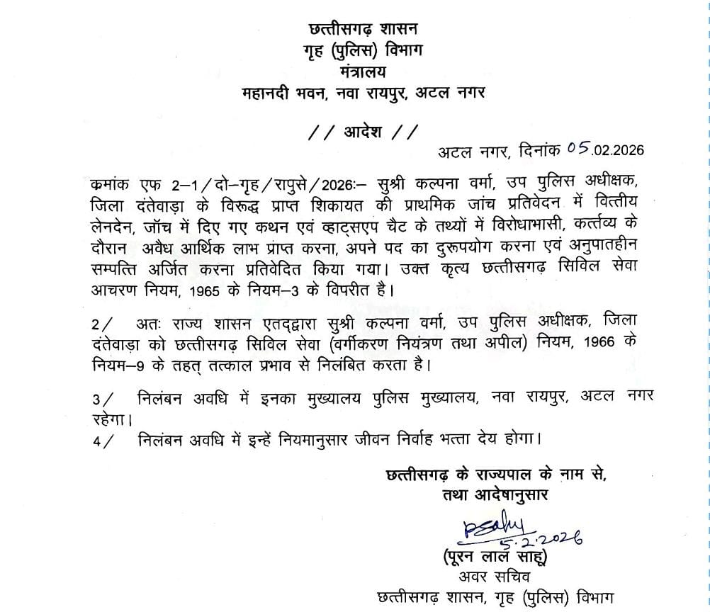 मामले में प्रशासन ने एक्शन लेते हुए कल्पना वर्मा को तत्काल प्रभाव से निलंबित कर दिया है।निलंबन अवधि में उन्हें नियमानुसार जीवन निर्वाह भत्ता देय होगा। यह आदेश छत्तीसगढ़ के राज्यपाल के नाम से जारी किया गया है।