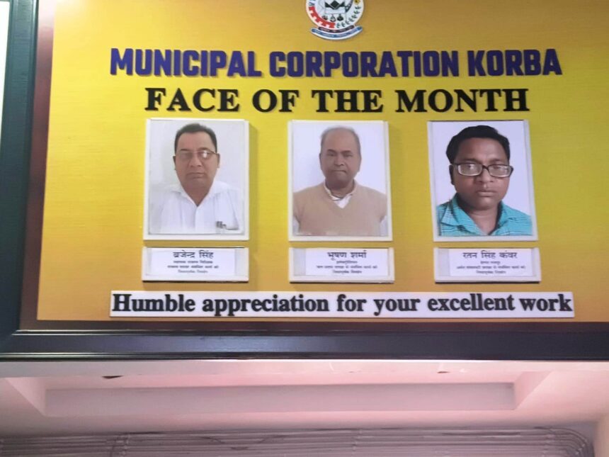 कोरबा 06 फरवरी 2026 -नगर पालिक निगम कोरबा के सहायक राजस्व निरीक्षक ब्रजेन्द्र सिंह , इलेक्ट्रीशियन भूषण शर्मा एवं हेल्पर मजदूर रतन िंसह कंवर को फरवरी माह का ’’ फेस आफ द मंथ ’’ चुना गया है। महापौर श्रीमती संजूदेवी राजपूत व आयुक्त आशुतोष पाण्डेय ने ’’ फेस आफ द मंथ ’’ चुने गए इन कर्मचारियों को बधाई दी है तथा कार्य के प्रति उनकी निष्ठा की सराहना की है।