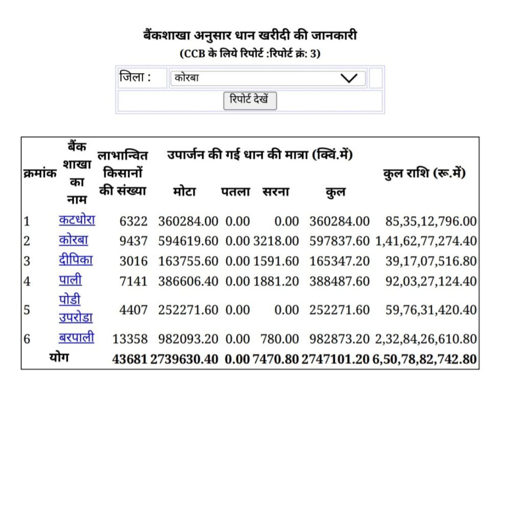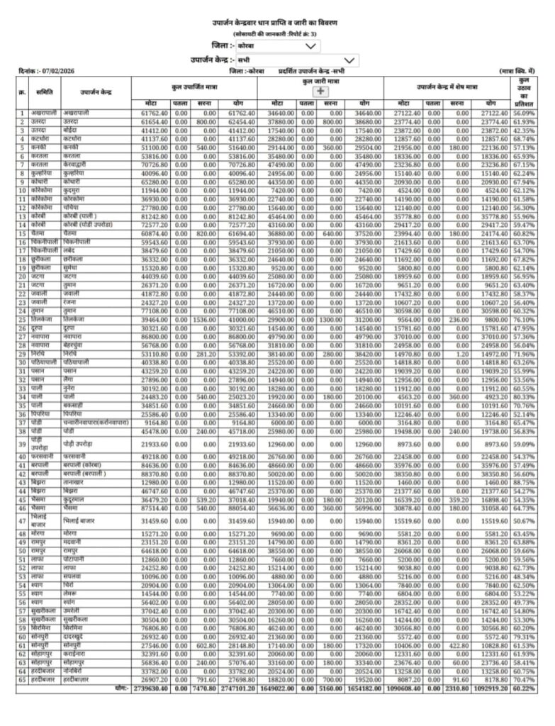 जारी अंतिम आंकड़ों के अनुसार कोरबा जिले की 41 समितियों के 65 उपार्जन केंद्रों में कुल 43 हजार 861 किसानों ने 27 लाख 47 हजार 101.20 क्विंटल धान समर्थन मूल्य पर शासन को बेचा, जिसकी कुल कीमत 650 करोड़ 78 लाख 82 हजार 742.80 रुपये है। इसके बावजूद जिले के कुल 52 हजार 566 पंजीकृत किसानों में से 8 हजार 875 किसान, यानी 16.57 प्रतिशत किसान, उपार्जन केंद्रों में अपना धान नहीं बेच सके। तय लक्ष्य 31.19 लाख क्विंटल की तुलना में जिला 11.92 प्रतिशत पीछे रह गया और 3 लाख 71 हजार 898.8 क्विंटल धान की आवक नहीं हो सकी।