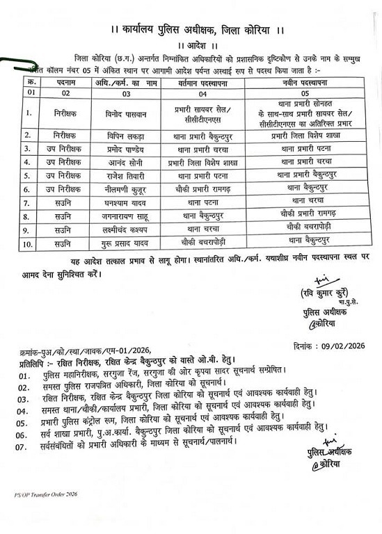 CG Police Transfer Breaking : छत्तीसगढ़ के कोरिया जिले के पुलिस विभाग में बड़ा फेरबदल किया गया है।
