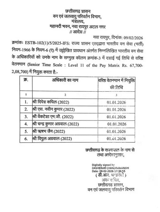 रायपुर,10 फरवरी(वेदांत समाचार) । राज्य शासन ने भारतीय वन सेवा (IFS) के 6 अधिकारियों को वरिष्ठ वेतनमान पर पदोन्नत किया गया है। फिलहाल पदोन्नत अधिकारियों की नई पदस्थापना नहीं की गई है। शासन स्तर पर यह कदम वन विभाग में प्रशासनिक व्यवस्था को और सुदृढ़ करने की दिशा में उठाया गया है।