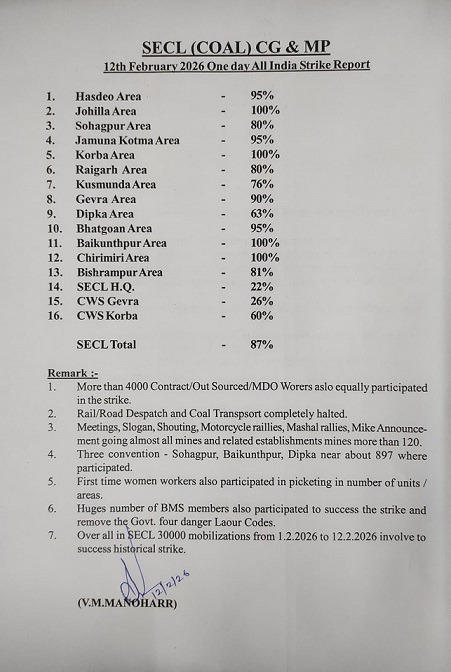 कोरबा, 12 फरवरी 2026। गेवरा क्षेत्र/परियोजना में गुरुवार को संयुक्त यूनियन HMS, AITUC, INTUC एवं CITU के आह्वान पर मजदूर विरोधी बताए जा रहे लेबर कोर्ट के निर्णय के खिलाफ एक दिवसीय हड़ताल की गई। यूनियन पदाधिकारियों के अनुसार हड़ताल पूर्णतः सफल रही और श्रमिकों ने बड़ी संख्या में भागीदारी दर्ज कराई।