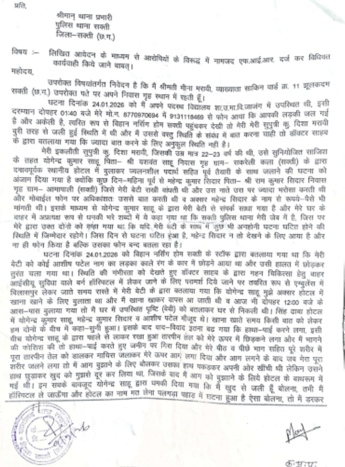 दरअसल, दिशा मरावी कॉलेज में पढ़ाई करती थी, जबकि मां मीना मरावी सरकारी स्कूल में लेक्चरर है। 2008 में पति से तलाक के बाद मां-बेटी अलग रहते थे। वहीं दिशा और सब्जी व्यापारी योगेंद्र साहू के बीच प्रेम संबंध था। मां मीना मरावी के अनुसार, 24 जनवरी 2026 की दोपहर करीब 1:40 बजे मीना मरावी को एक अज्ञात नंबर से कॉल आया। कॉल करने वाले ने बताया कि दिशा गंभीर रूप से जली हुई हालत में बिहान नर्सिंग होम में एडमिट है। जानकारी मिलते ही मां अस्पताल पहुंची। गंभीर हालत को देखते हुए डॉक्टरों ने प्राथमिक इलाज के बाद दिशा को बेहतर उपचार के लिए बिलासपुर रेफर किया। दिशा को बर्न उपचार सुविधा वाले अस्पताल में भर्ती कराया गया था। वहां आईसीयू में इलाज के दौरान 1 फरवरी को उसकी मौत हो गई। इस घटना के बाद बिलासपुर के तारबाहर थाना में शून्य में केस दर्ज किया गया। इसके बाद पोस्टमॉर्टम की कार्रवाई की गई। हालांकि, अभी तक केस डायरी और रिपोर्ट सक्ती पुलिस को नहीं सौंपी गई है।