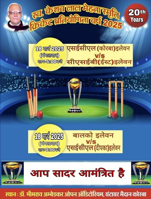 कोरबा,18 मार्च 2025 (वेदांत समाचार) । कोरबा प्रेस क्लब कोरबा द्वारा आयोजित होने वाले स्व. केशव लाल मेहता स्मृति क्रिकेट प्रतियोगिता का भव्य शुभारंभ 18 मार्च मंगलवार को हो रहा है। घंटाघर स्थित ओपन थियेटर मैदान में दूधिया रोशनी के बीच क्रिकेट प्रतियोगिता का शुभारंभ कोरबा नगर निगम महापौर श्रीमती संजू देवी राजपूत के मुख्य आतिथ्य में होगा।