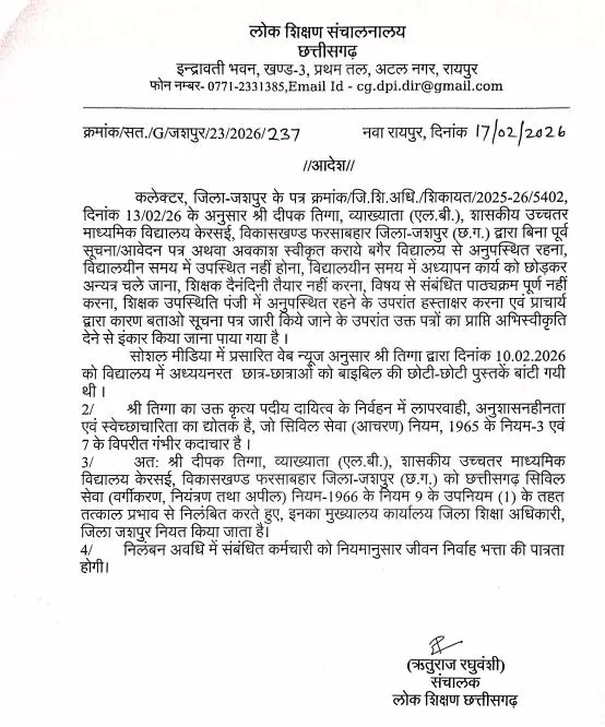 दीपक तिग्गा, व्याख्याता (एल.बी.), शासकीय उच्चतर माध्यमिक विद्यालय केरसई, विकासखण्ड फरसाबहार जिला-जशपुर (छ.ग.) द्वारा बिना पूर्व सूचना/आवेदन पत्र अथवा अवकाश स्वीकृत कराये बगैर विद्यालय से अनुपस्थित रहना, विद्यालयीन समय में उपस्थित नहीं होना, विद्यालयीन समय में अध्यापन कार्य को छोड़कर अन्यत्र चले जाना, शिक्षक दैनंदिनी तैयार नहीं करना, विषय से संबंधित पाठ्यक्रम पूर्ण नहीं करना, शिक्षक उपस्थिति पंजी में अनुपस्थित रहने के उपरांत हस्ताक्षर करना एवं प्राचार्य द्वारा कारण बताओ सूचना पत्र जारी किये जाने के उपरांत उक्त पत्रों का प्राप्ति अभिस्वीकृति देने से इंकार किया जाना पाया गया है।