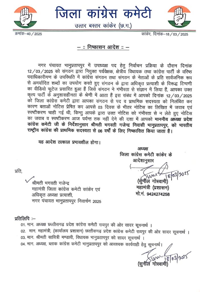 भानुप्रतापपुर कांग्रेस पार्टी के निर्णय के विरूद्ध नगर पंचायत भानुप्रतापपुर में भाजपा प्रत्याशी के पक्ष में मतदान करने व संगठन के नेताओं के प्रति सार्वजनिक रूप से अमर्यादित शब्दों का उपयोग करते हुए अधिकृत प्रत्याशी के विरुद्ध टिप्पणी करने वाले भानुप्रतापपुर नगर पंचायत अध्यक्ष पद की प्रत्याशी भगवती गजेंद्र व वार्ड क्रमांक के पार्षद तुषार ठाकुर को 6 वर्षों के लिए कांग्रेस पार्टी से निष्कासित किया है।