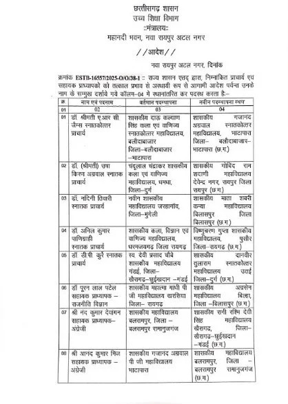 रायपुर,23फरवरी (वेदांत समाचार)। छत्तीसगढ़ के उच्च शिक्षा विभाग ने प्रशासनिक फेरबदल करते हुए 5 प्राचार्यों और 4 सहायक प्रोफेसरों के तबादले के आदेश जारी किए हैं। आदेश मंत्रालय से जारी किया गया है, जिसके बाद संबंधित अधिकारियों को नवीन पदस्थापना स्थल पर तत्काल प्रभाव से कार्यभार ग्रहण करने के निर्देश दिए गए हैं।