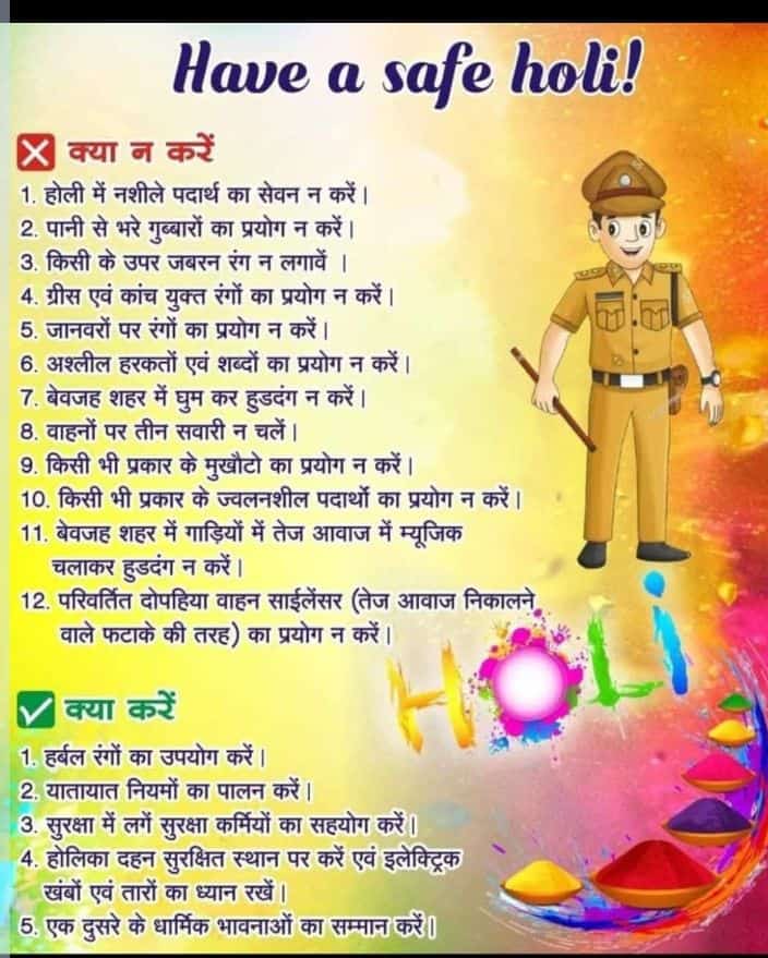 पुलिस ने डीजे बजाकर शोर-शराबा करने, दोपहिया वाहन में तीन सवारी बैठाने, मुखौटा लगाकर वाहन चलाने, शराब या नशीले पदार्थों का सेवन कर वाहन चलाने और सार्वजनिक शांति भंग करने वालों के खिलाफ कठोर कार्रवाई करने की बात कही है। इसके साथ ही जबरन रंग लगाने, जबरन चंदा वसूलने, महिलाओं से अभद्र व्यवहार करने और सार्वजनिक या निजी संपत्ति को नुकसान पहुंचाने वालों पर भी सख्ती बरती जाएगी।