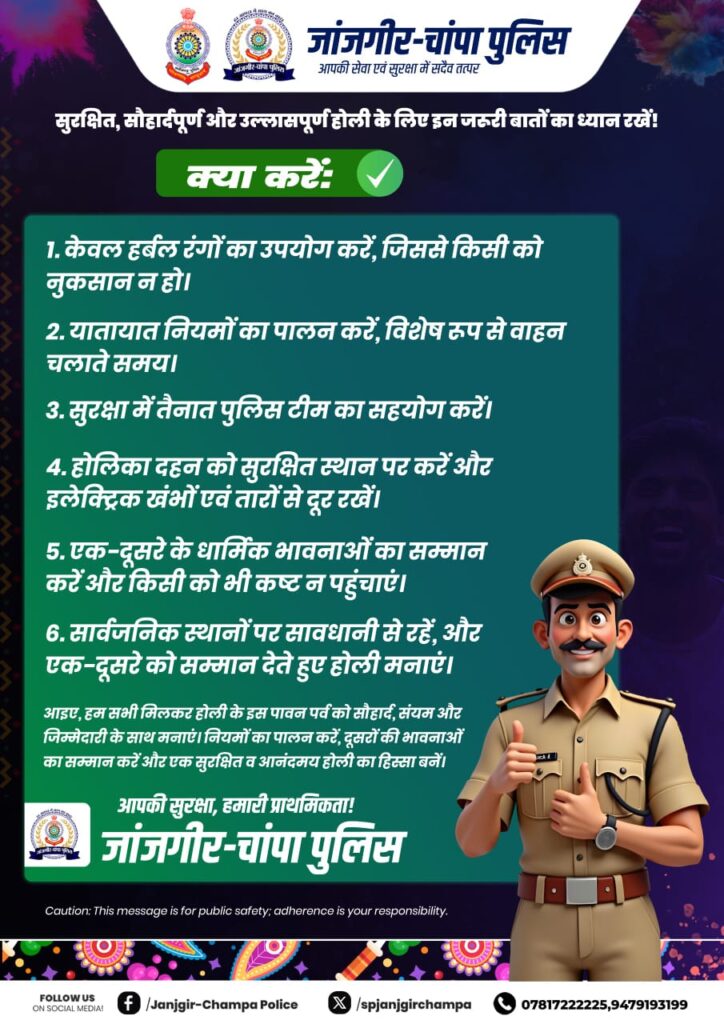 जांजगीर-चांपा पुलिस ने नागरिकों से अपील की है कि वे होली का पर्व सौहार्दपूर्ण वातावरण में मनाएं और किसी के साथ जबरदस्ती न करें। पुलिस ने लोगों से हानिकारक पदार्थों का उपयोग न करने, नशापान से दूर रहने और होलिका दहन निर्धारित समय और नियमों के अनुसार करने का आग्रह किया है। पुलिस ने कहा है कि सभी नागरिकों के सहयोग से ही जिले में शांतिपूर्ण और सुरक्षित होली सुनिश्चित की जा सकती है।