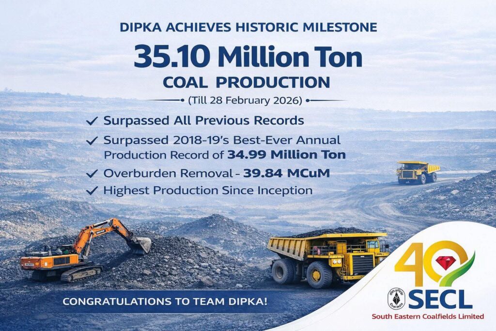 कोरबा, 01 मार्च 2026 (वेदांत समाचार)। एसईसीएल की दीपका कोयला परियोजना ने उत्पादन और गुणवत्ता दोनों क्षेत्रों में ऐतिहासिक उपलब्धि हासिल करते हुए नया कीर्तिमान स्थापित किया है। 28 फरवरी 2026 तक परियोजना ने 35.07 मिलियन टन कोयला उत्पादन दर्ज किया, जो वर्ष 2018-19 के सर्वश्रेष्ठ वार्षिक उत्पादन के रिकॉर्ड से भी अधिक है। इस उपलब्धि के साथ दीपका परियोजना ने अपने पिछले सभी उत्पादन रिकॉर्ड पीछे छोड़ दिए हैं।