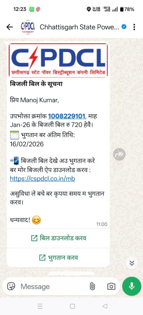 रायपुर, 6 मार्च 2026। डिजिटल सेवाओं के बढ़ते उपयोग के बीच प्रदेश के बिजली उपभोक्ताओं में मातृभाषा छत्तीसगढ़ी के प्रति विशेष लगाव दिखाई दे रहा है। छत्तीसगढ़ स्टेट पॉवर कंपनीज की डिजिटल सेवाओं में बड़ी संख्या में उपभोक्ता अब छत्तीसगढ़ी भाषा में सूचना प्राप्त करना पसंद कर रहे हैं, जो स्थानीय भाषा के प्रति बढ़ते विश्वास और अपनत्व को दर्शाता है।