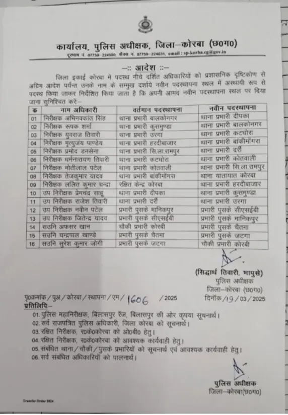 कोरबा, 19 मार्च (वेदांत समाचार)। कोरबा जिले के पुलिस विभाग में बड़ा फेरबदल हुआ है। एसपी कोरबा ने 9 निरीक्षकों सहित 16 पुलिसकर्मियों का तबादला आदेश जारी किया है। इस फेरबदल से जिले की पुलिस व्यवस्था में बड़ा बदलाव होने की उम्मीद है।