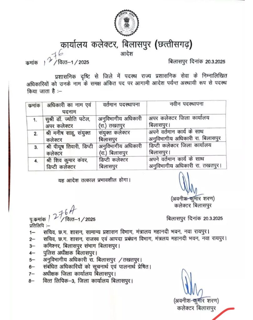 जारी आदेश के अनुसार, डॉ. ज्योति पटेल को अपर कलेक्टर, बिलासपुर के पद पर नियुक्त किया गया है। मनीष साहू को संयुक्त कलेक्टर बनाया गया है। इसके साथ ही उन्हें अनुविभागीय अधिकारी (राजस्व), बिलासपुर का अतिरिक्त प्रभार भी दिया गया है। वहीं पीयूष तिवारी को डिप्टी कलेक्टर, बिलासपुर की जिम्मेदारी सौंपी गई है। शिव कुमार कंवर को डिप्टी कलेक्टर पद पर पदस्थ किया गया है। इसके अलावा, उन्हें अनुविभागीय अधिकारी, तखतपुर का अतिरिक्त प्रभार भी दिया गया है।