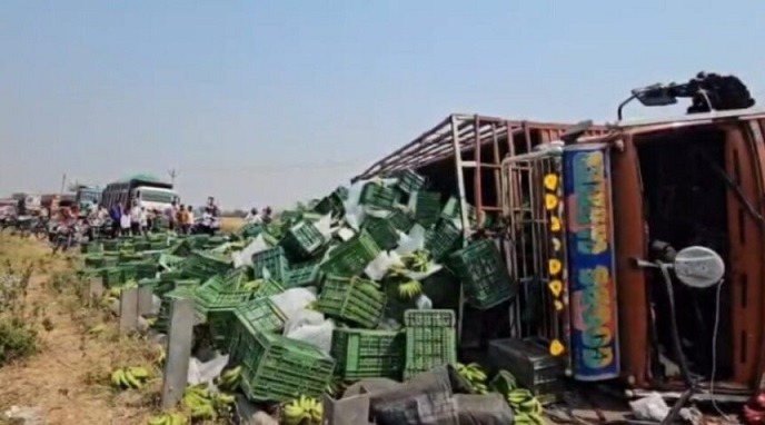 खैरागढ़,14 मार्च (वेदांत समाचार) । महाराष्ट्र के अंजन गांव से केला लेकर बिलासपुर जा रही एक माजदा (मिनी ट्रक) शनिवार सुबह खैरागढ़-धमधा मुख्य मार्ग पर भीषण हादसे का शिकार हो गई। ग्राम संडी के पास एक खतरनाक मोड़ पर अचानक टायर फटने से वाहन क्रमांक MH 28 BB 3398 अनियंत्रित होकर सड़क के बीचों-बीच पलट गया। हादसा सुबह करीब 11 बजे का बताया जा रहा है। गनीमत रही कि घटना के वक्त वहां कोई राहगीर मौजूद नहीं था, जिससे एक बड़ा हादसा टल गया।