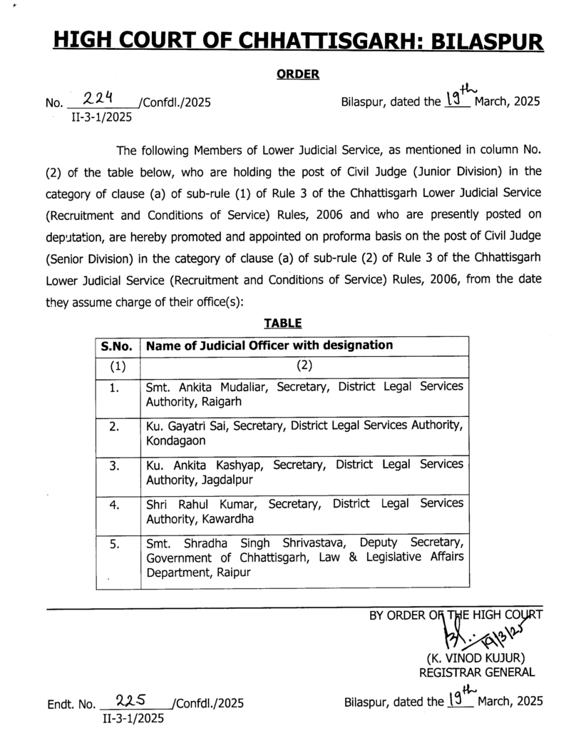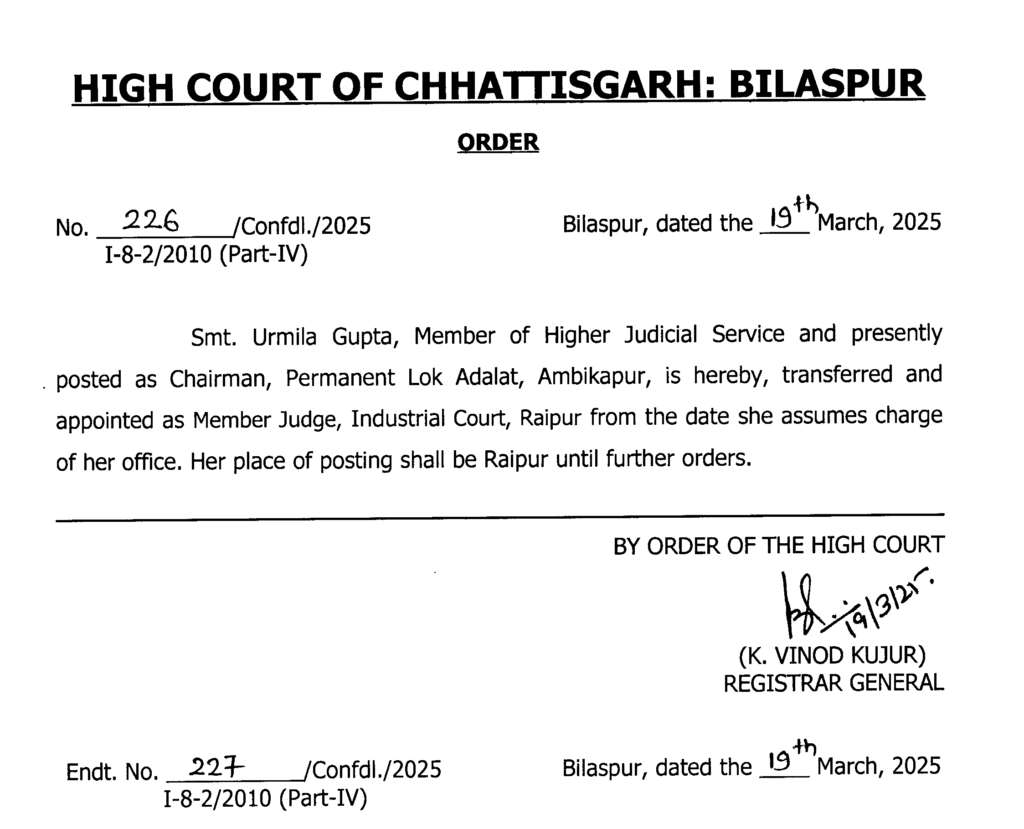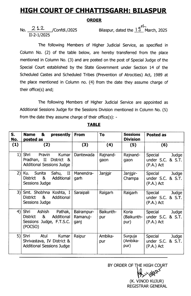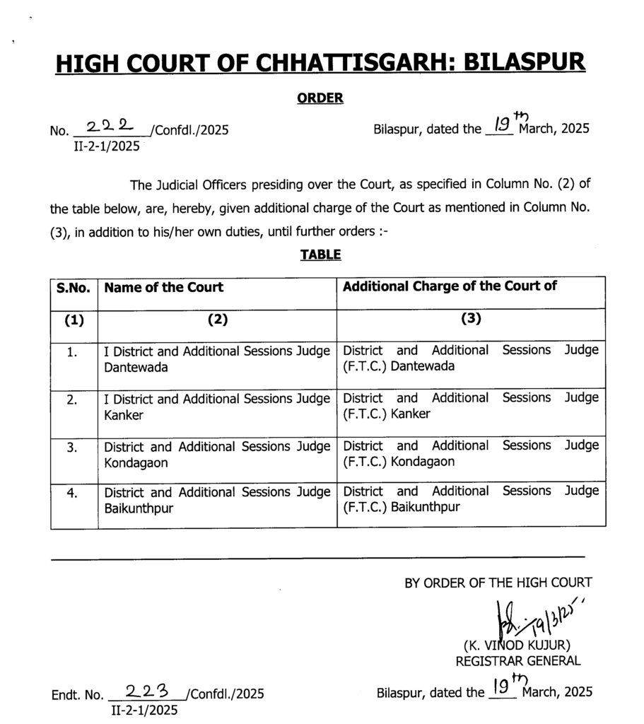 छत्तीसगढ़ हाईकोर्ट ने बड़ी संख्या में सिविल जजों (सीनियर डिवीजन) का ट्रांसफर किया है। आदेश के अनुसार सिविल जजों का प्रदेश की अलग-अलग अदालतों में तबादला किया गया है। हाईकोर्ट ने संबंधित न्यायिक अधिकारियों को नए पदस्थापन स्थल पर जल्द कार्यभार ग्रहण करने के निर्देश दिए हैं।