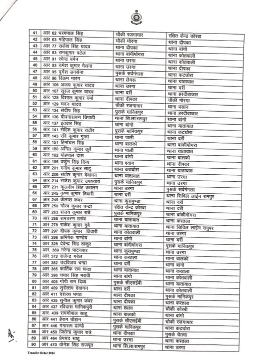 कोरबा,22 मार्च (वेदांत समाचार)। छत्तीसगढ़ के कोरबा जिले के पुलिस विभाग में बंपर तबादलकिया गया है। पुलिस अधीक्षक सिद्धार्थ तिवारी ने 213 पुलिसकर्मियों का तबादला आदेश जारी किया है। इस लिस्ट में 29 महिला आरक्षकों के नाम भी शामिल है।