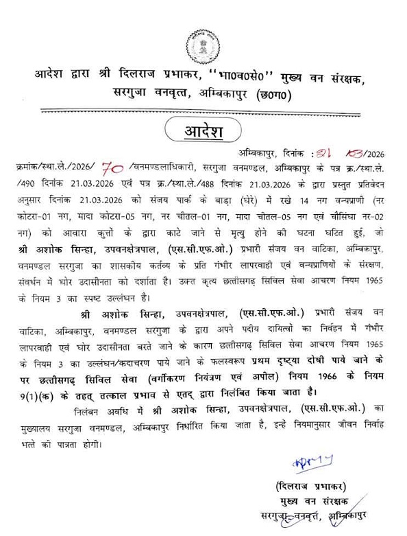 अंबिकापुर,22 मार्च (वेदांत समाचार)। नगर के संजय वन वाटिका में आवारा कुत्तों के हमले से 15 हिरणों की मौत के मामले में वन विभाग ने सख्त कार्रवाई की है। मुख्य वन संरक्षक, सरगुजा वनवृत्त दिलराज प्रभाकर ने गंभीर लापरवाही पाते हुए वन वाटिका के प्रभारी सहित तीन सहायकों को तत्काल प्रभाव से निलंबित कर दिया है।