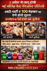 रायपुर, 23 मार्च (वेदांत समाचार)। छत्तीसगढ़ सहित पूरे देश में 1 अप्रैल 2026 से नई सॉलिड वेस्ट मैनेजमेंट पॉलिसी लागू होने जा रही है। इस नई व्यवस्था के तहत कचरा प्रबंधन को लेकर नियमों को और सख्त किया गया है। अब शादी, जन्मदिन या किसी भी निजी या सार्वजनिक आयोजन में यदि 100 से अधिक मेहमान शामिल होते हैं, तो आयोजक को कम से कम तीन दिन पहले नगर निगम या नगर पालिका को इसकी सूचना देनी अनिवार्य होगी। नियमों का पालन नहीं करने पर 500 रुपये से लेकर 50 हजार रुपये तक का जुर्माना लगाया जा सकता है।