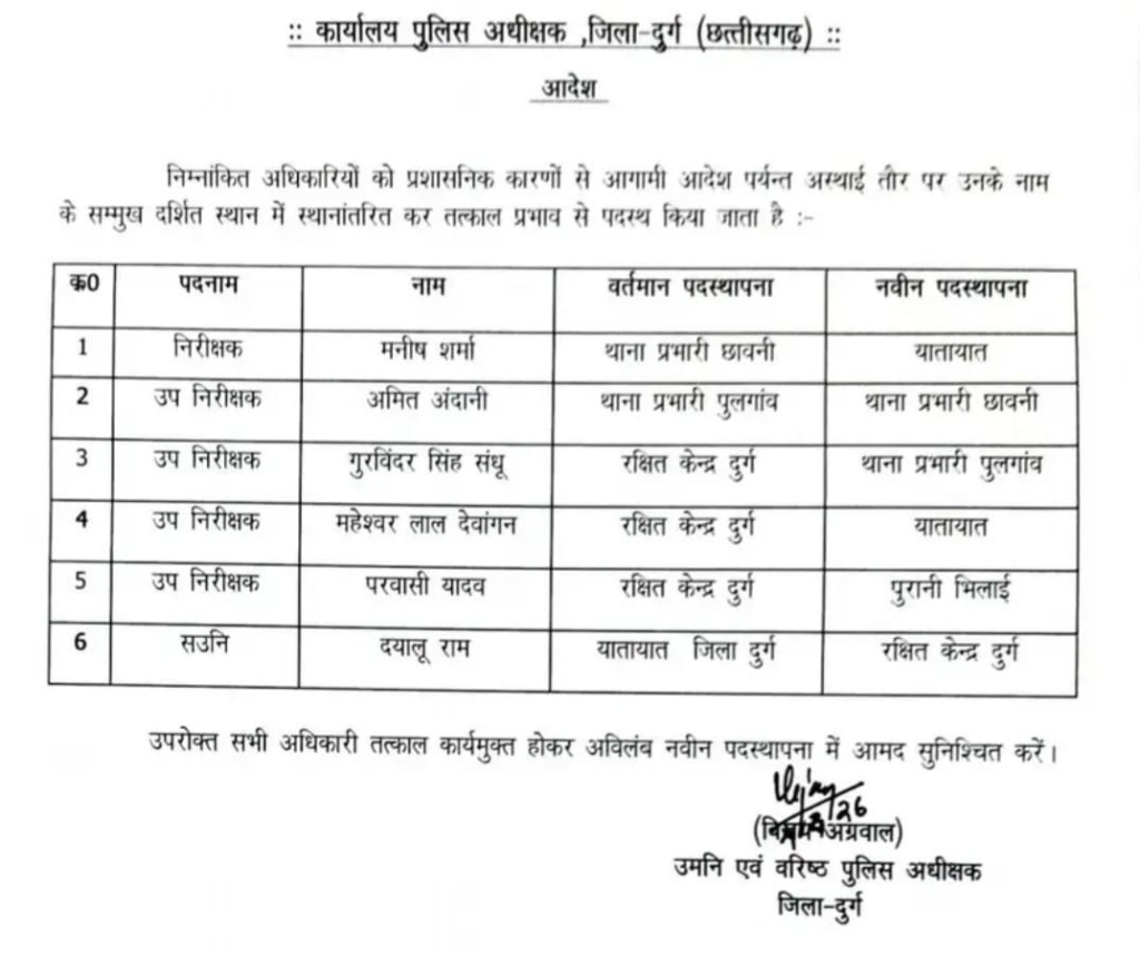 सभी को तत्काल नई पदस्थापना स्थल पर कार्यभार ग्रहण करने के निर्देश दिए गए हैं।