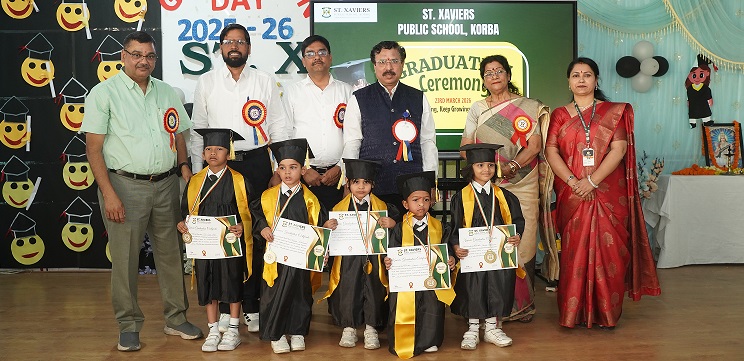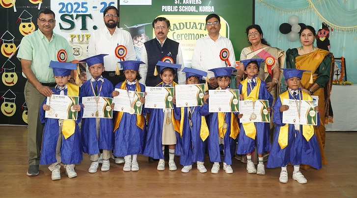 कोरबा, 23 मार्च 2026। सेंट जेवियर्स पब्लिक स्कूल, कोरबा में सोमवार को गरिमामय एवं भव्य ग्रेजुएशन सेरेमनी का आयोजन किया गया। कार्यक्रम का शुभारंभ प्रातः 9:30 बजे हुआ। मुख्य अतिथि के रूप में अदानी कोरबा पावर लिमिटेड के प्लांट हेड मुला रवि उपस्थित रहे। विशिष्ट अतिथियों में जीएम अखिलेश सिंह एवं एचआर विभाग से किशोर कुमार सिंह शामिल हुए। अतिथियों का पारंपरिक तरीके से बैज लगाकर एवं पुष्पगुच्छ देकर स्वागत किया गया। कार्यक्रम में विद्यालय के चेयरमैन प्रमोद झा, प्रबंधक डॉ. डी. के. आनंद, प्रभारी प्राचार्या रीता मुखर्जी, शिक्षकगण, अभिभावक एवं बड़ी संख्या में विद्यार्थी उपस्थित रहे। समारोह की शुरुआत गुरुवंदना से हुई, जिसमें विद्यार्थियों ने अपने गुरुजनों के प्रति श्रद्धा व्यक्त की। इसके बाद दीप प्रज्ज्वलन कर कार्यक्रम का औपचारिक शुभारंभ किया गया।