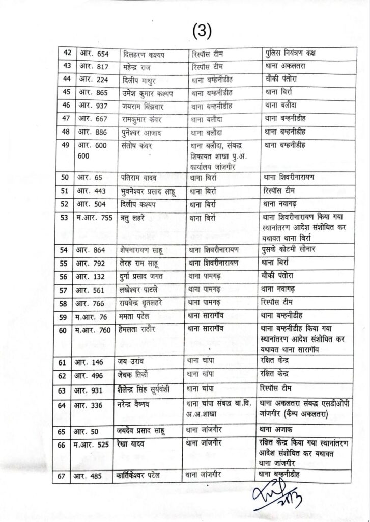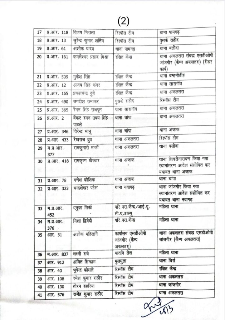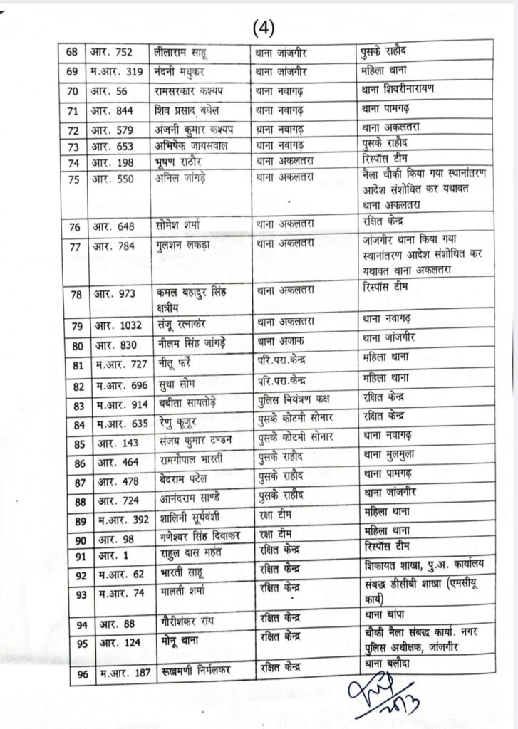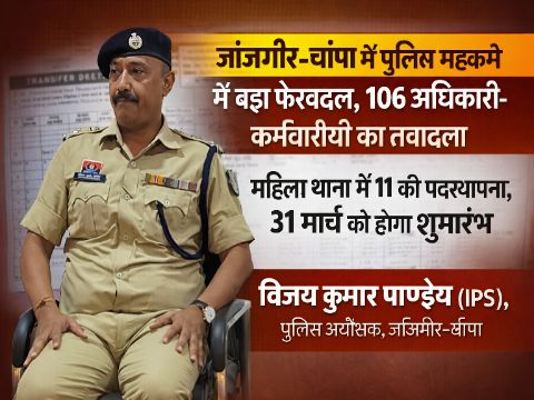 जांजगीर-चांपा, 25 मार्च 2026। जिले में कानून-व्यवस्था को और अधिक सुदृढ़ बनाने के उद्देश्य से पुलिस विभाग में व्यापक स्तर पर फेरबदल किया गया है। पुलिस अधीक्षक विजय कुमार पाण्डेय (IPS) द्वारा जारी आदेश के तहत कुल 106 पुलिस अधिकारी एवं कर्मचारियों का तबादला करते हुए उन्हें नई पदस्थापना दी गई है।