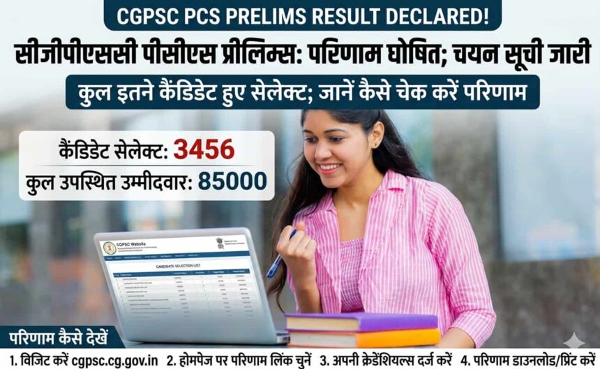 छत्तीसगढ़ लोक सेवा आयोग की प्री परीक्षा का रिजल्ट जारी कर दिया गया है. राज्य सेवा (प्रारंभिक) परीक्षा–2025 के लिखित परीक्षा परिणाम के आधार पर विज्ञापित पदों का 15 गुना अर्थात 3975 अभ्यर्थियों का चिन्हांकन किया जाना था, परंतु वर्गवार/उपवर्गवार अर्ह अभ्यर्थियों की उपलब्धता के आधार पर कुल 3921 अभ्यर्थी मेंस परीक्षा के लिए सेलेक्ट हुए हैं. 16 से 19 मई तक अब मेंस की परीक्षा होगी. जबकि 22 फरवरी को प्री परीक्षा हुई थी.