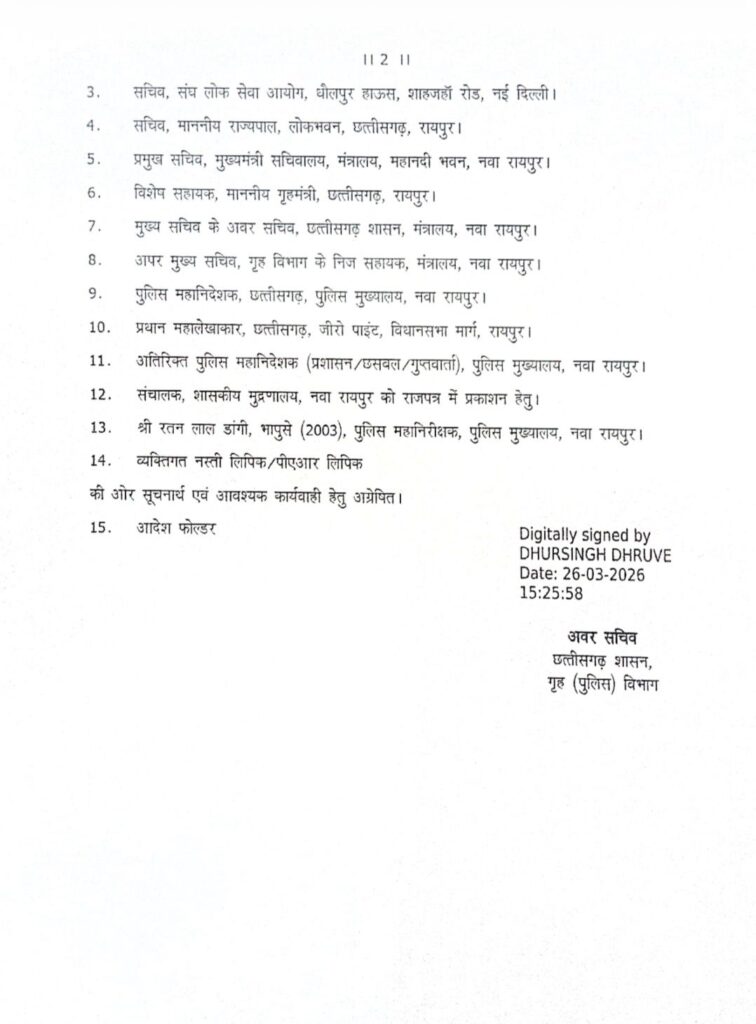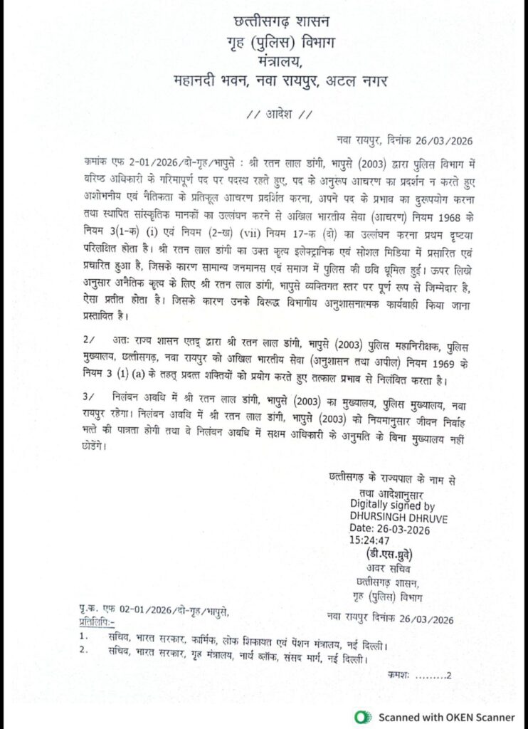 रायपुर, 26 मार्च (वेदांत समाचार)। प्रदेश सरकार ने वरिष्ठ आईपीएस अधिकारी रतन लाल डांगी पर बड़ा प्रशासनिक एक्शन लेते हुए उन्हें निलंबित कर दिया है। गृह विभाग द्वारा जारी आदेश में यह स्पष्ट किया गया है कि हाल ही में सोशल मीडिया पर वायरल हुए आपत्तिजनक फोटो के मामले को गंभीरता से लेते हुए यह कार्रवाई की गई है।