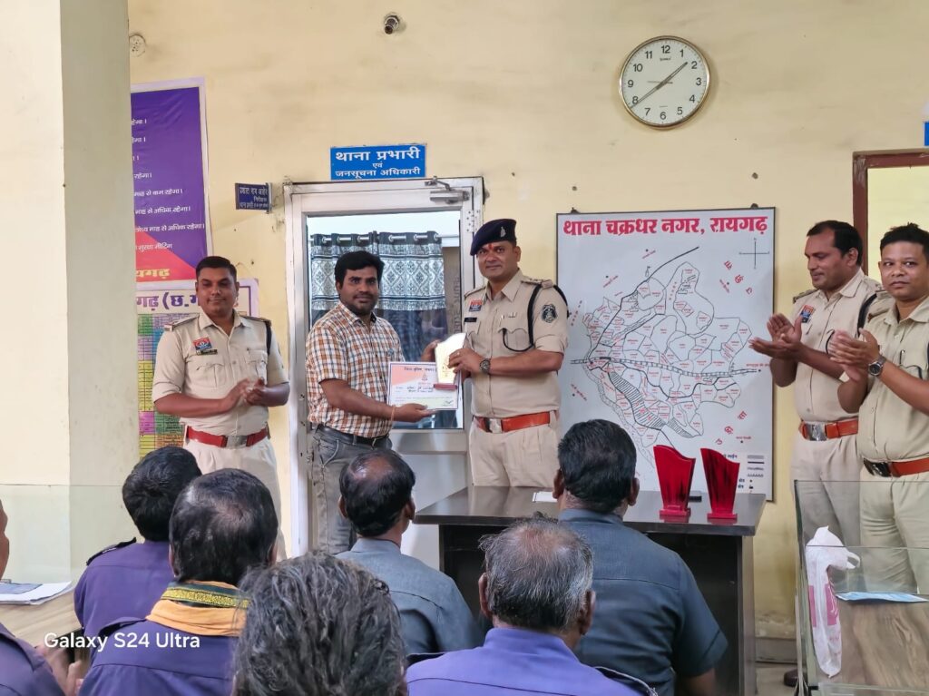 रायगढ़, 21 मार्च, (वेदांत समाचार)। रायगढ़ के चक्रधरनगर थाना परिसर में आज एक विशेष कार्यक्रम आयोजित किया गया, जिसमें मेधावी छात्रों, समर्पित शिक्षकों, नर्सिंग स्टाफ, ग्राम कोटवारों और पुलिस मित्रों को उनके उत्कृष्ट कार्यों के लिए सम्मानित किया गया। पुलिस अधीक्षक श्री दिव्यांग कुमार पटेल के निर्देश पर आयोजित इस कार्यक्रम में थाना प्रभारी निरीक्षक प्रशांत राव ने इन सेवाभावी लोगों को मोमेंटो और प्रशस्ति पत्र देकर उनका उत्साहवर्धन किया।