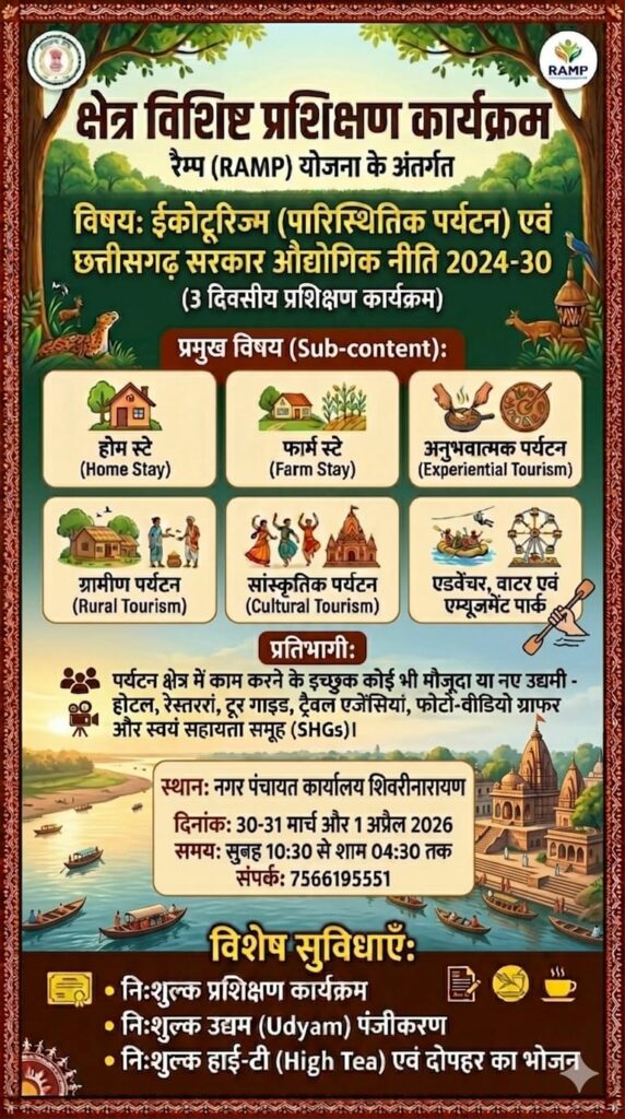 जांजगीर चांपा, 28 मार्च (वेदांत समाचार)। भारत सरकार की रैंप योजना अंतर्गत सीएसआईडीसी रायपुर के बैनर तले एनआईएमएसएमई हैदराबाद द्वारा सेक्टर स्पेसिफिक ट्रेनिंग प्रोग्राम के तहत 30, 31 मार्च एवं 1 अप्रैल को सीएमओ ऑफिस, शिवरीनारायण में 3 दिवसीय इको टूरिज्म प्रशिक्षण कार्यक्रम आयोजित किया जाएगा। प्रशिक्षण तीन दिवस होगा, प्रशिक्षण तीन दिवस में सुबह 10:30 से शाम के 4:30 बजे तक आयोजित होगी ।