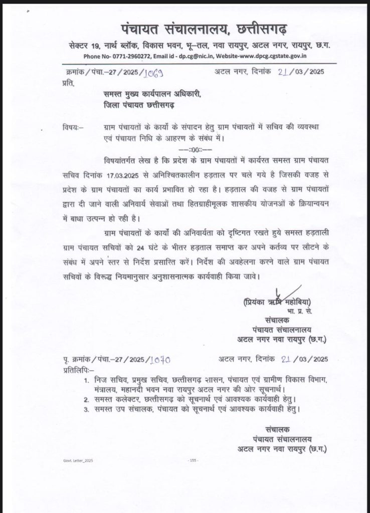 बता दें, प्रदेश के ग्राम पंचायतों में कार्यरत समस्त ग्राम पंचायत सचिव 17 मार्च 2025 से अनिश्चितकालीन हड़ताल पर चले गए हैं, जिसके कारण ग्राम पंचायतों का कार्य प्रभावित हो रहा है. हड़ताल के कारण अनिवार्य सेवाओं और हितग्राहीमूलक शासकीय योजनाओं के क्रियान्वयन में भी रुकावट आ रही है. इसे देखते हुए संचालक ने सभी जिला पंचायतों के मुख्य कार्यपालन अधिकारियों को पत्र लिखकर यह आदेश जारी किया है और पत्र में ग्राम पंचायतों के कार्यों के संपादन हेतु सचिवों की व्यवस्था और पंचायत निधि के आहरण से संबंधित निर्देश दिए गए हैं.