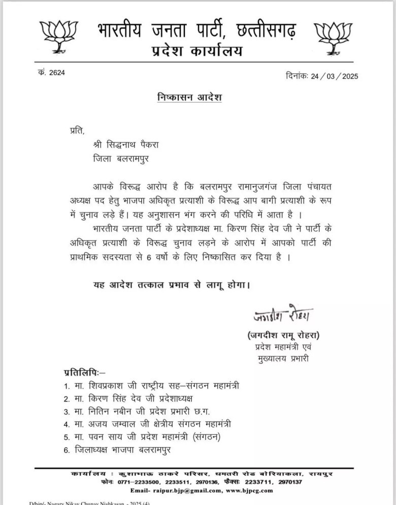 भाजपा प्रदेश प्रभारी किरण सिंह देव ने सिद्धनाथ पैकरा को 6 साल के लिए पार्टी से निष्कासित कर दिया है। यह कार्रवाई बलरामपुर जिला पंचायत अध्यक्ष और उपाध्यक्ष के चुनाव के बाद की गई है, जिसमें भाजपा समर्थित प्रत्याशियों ने दोनों ही पदों पर कब्जा जमाया था।